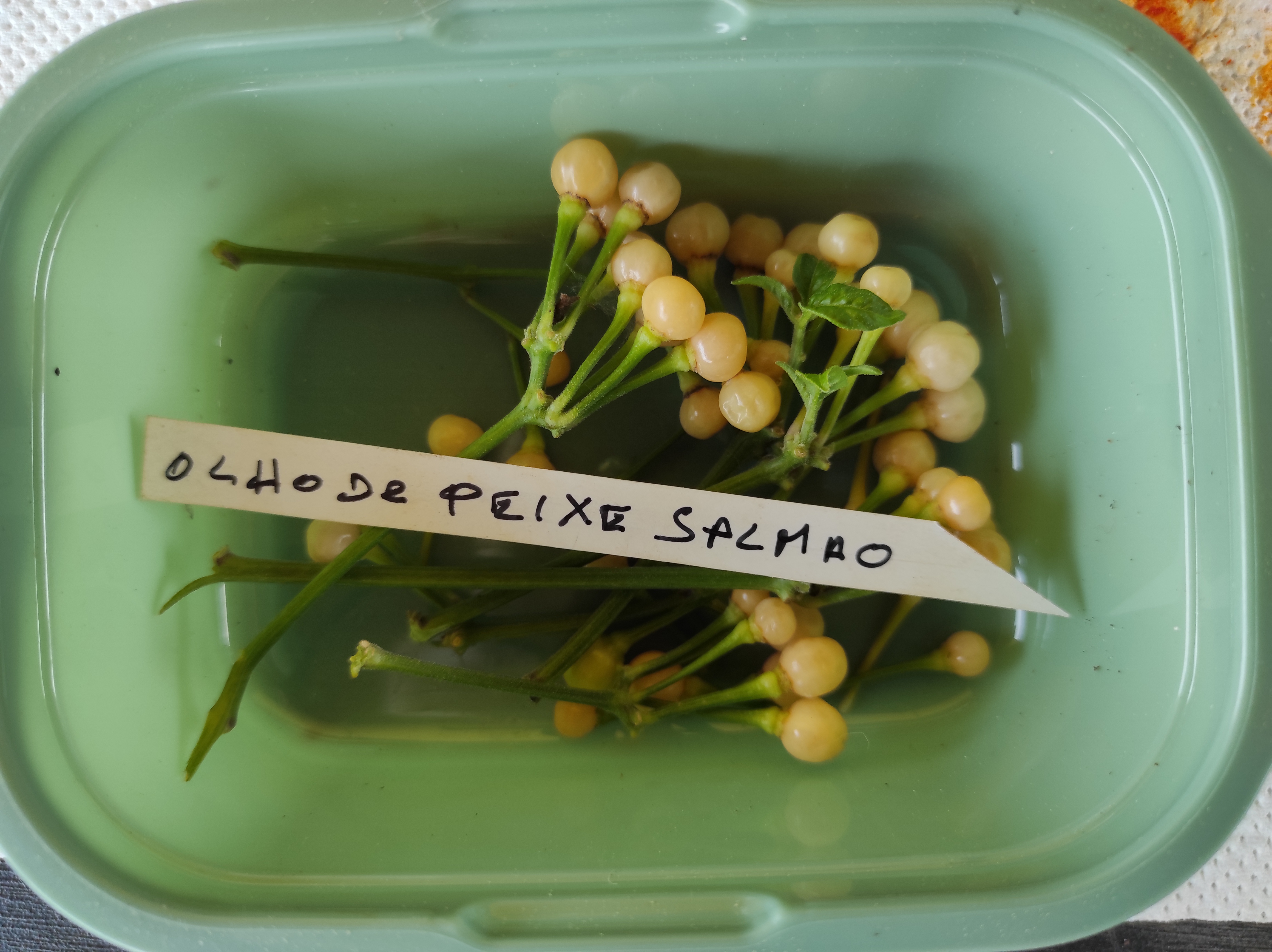 Pianta arbustiva e prolifica, tradotta dal portoghese “occhio di pesce”, questa è una varietà rarissima, produce piccoli frutti di forma tondeggiante delle dimensioni di un pisello, hanno una colorazione dal verde chiaro al colore salmone, dal sapore fruttato con sentore di agrumi, utilizzati freschi oppure per la produzione di salse e sughi.